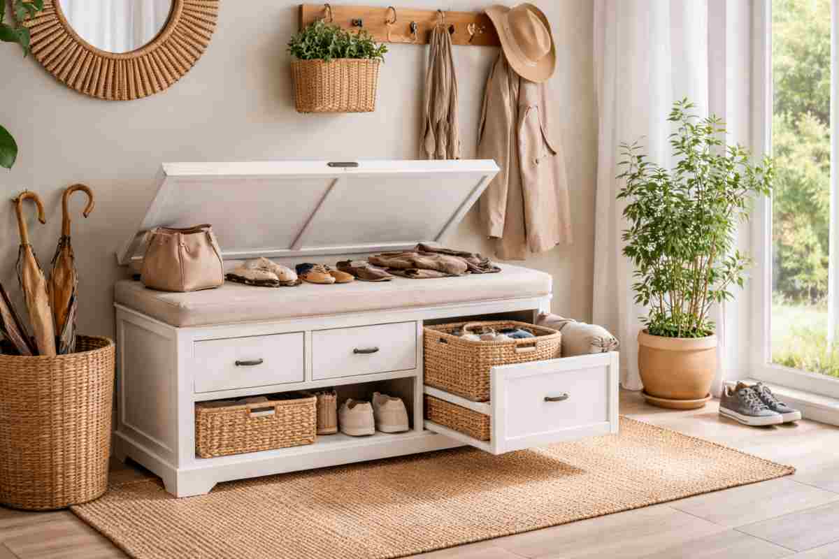 L’ingresso è il primo ambiente che accoglie gli ospiti, ma è anche quello che più facilmente si trasforma in un deposito caotico di scarpe, borse, chiavi e altri oggetti. Maisons du Monde ha pensato a una soluzione in grado di risolvere questo problema in modo elegante. Il mobile Newport integra una seduta con un vano nascosto sotto il cuscino, dove si possono riporre scarpe, borse, zaini e altri oggetti che non vuoi lasciare in giro. Il vano di stivaggio è profondo e capiente, perfetto per scarpe stagionali o accessori ingombranti. Grazie a questa funzionalità, l’ingresso sarà sempre ordinato e libero da pile disordinate.